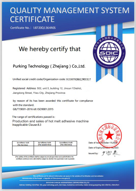 Purking Technology (Zhejiang) Co., Ltd.2014-жылы негизделген, бул изилдөө, иштеп чыгуу, маркетинг, персоналды окутуу жана сатуудан кийинки кызматты интеграциялаган, ысык эритин эритүүчү машине чыгаруучу кесипкөй компания, компаниянын фабрика имараттарынын 1000ден ашуун квадраттык метрлери бар. Компаниянын соода борбору Чжэцзян провинциясынын Йиу шаарында жайгашкан. Өндүрүү жана жыйноо борбору Гуандун провинциясынын Донггуан шаарында жайгашкан. |